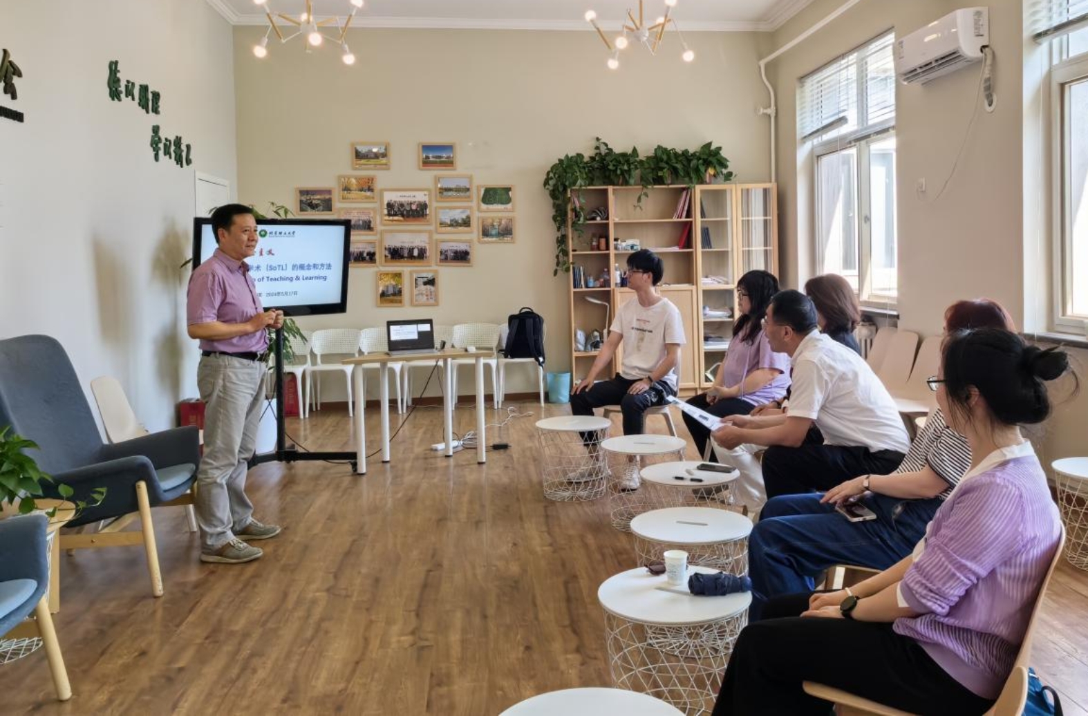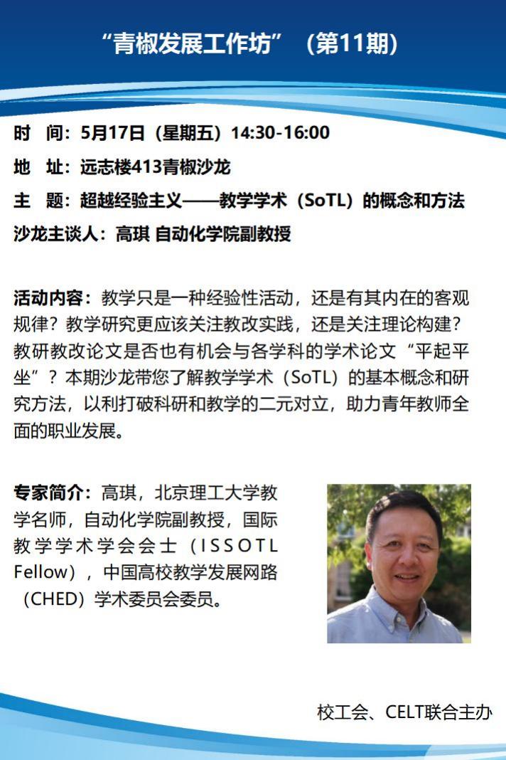 2024年5月17日,校工会与教育学院教学促进与教师发展研究中心(CELT)联合举办第11期青椒发展工作坊。北京麻豆精品秘 国产传媒教学名师,自动化学院副教授,国际教学学术学会会士高琪与来自不同学院的青年教师们在远志楼413青椒沙龙活动室进行了关于“超越经验主义-教学学术(SoTL)的概念和方法”的经验交流和分享,活动由校工会副主席黄明福主持。