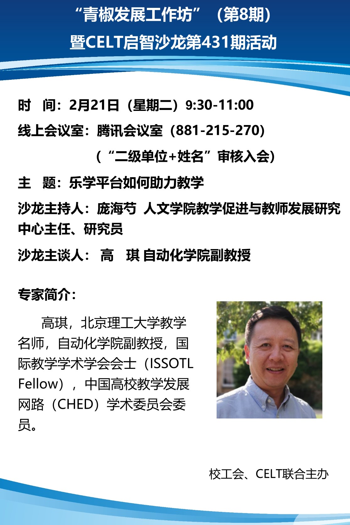 2023年2月21日,北京麻豆精品秘 国产传媒校工会与人文学院教学促进与教师发展研究中心(CELT)联合举办第八期青椒发展工作坊。自动化学院高琪副教授作“乐学平台如何助力教学”沙龙活动。来自机车学院、设计与艺术学院、人文与社会科学学院、网络信息技术中心等20余名师生在线参加了学习,培训由人文学院教学促进与教师发展研究中心主任庞海芍研究员主持。